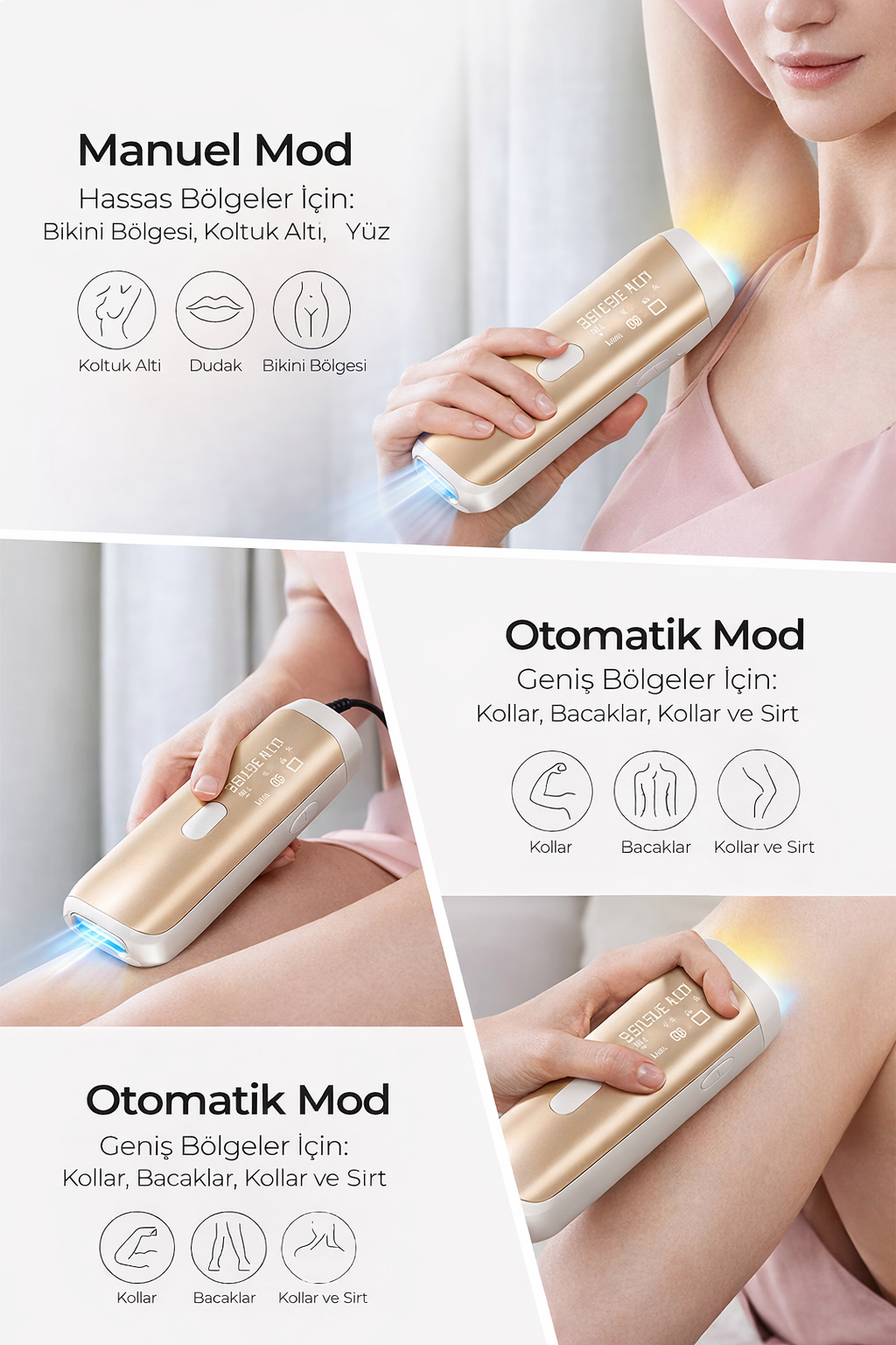 Cihaz bacaklarda, kollarda, koltuk altlarında, bikini bölgesinde ve yüzde (elmacık kemiklerinin altında) güvenle kullanılabilir. Dövme, yara izi veya açık yara olan bölgelerde kullanmaktan kaçının.